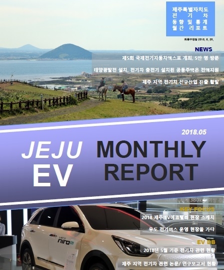 제주연구원 전기차정책연구센터에서 발행한 제주EV리포트 2018년 5월호에서는 국제전기차엑스포와 에코랠리 개최 등의 소식과 함께 우도 전기버스 운행 소식 등 주요 동향을 다루고 있다.