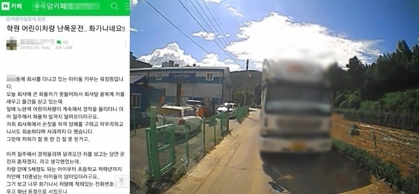 여성 ㄱ씨는 지난 3일 자신이 활동하고 있는 경기도 광주 지역의 ‘맘카페’에 ‘태권도 학원 차량이 어린 아이들을 태우고 거칠게 운전을 하는 거에 화가 난다’는 긴 내용의 글을 게시했다.