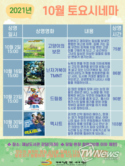 [제주교통복지신문=박희찬 기자] 제주도교육청 제남도서관은 지역주민들에게 풍요로운 문화생활 향유의 기회를 제공하고자 2021년 10월 토요시네마를 운영한다.