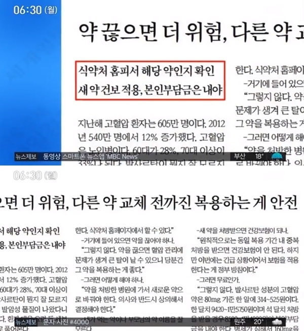 9일 오전 방송된 MBC ‘뉴스투데이’는 지난 7일 식약처가 일부 혈압약의 원료 중에서 발암물질이 검출돼 이백열아홉 개 제품의 판매 중지 등의 조치를 내렸다고 전했다.