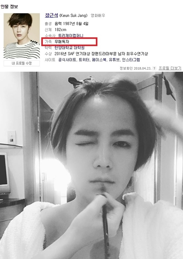한 대형포털사이트에서 장근석을 검색해 보면 인물정보란의 가족란에는 ‘무매독자’로 표기되어 있다.