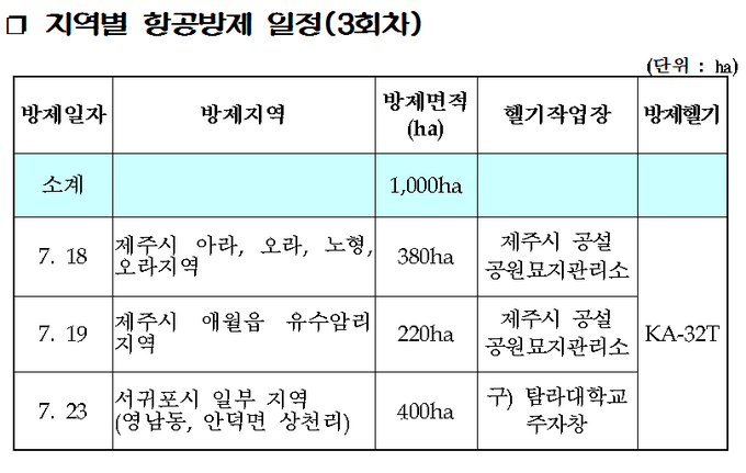 제주도는 소나무(해송)림에 피해를 주고 있는 소나무재선충병 확산방지를 위해 7월 19일부터 23일까지 3일간 3차 항공방제를 실시한다고 밝혔다.