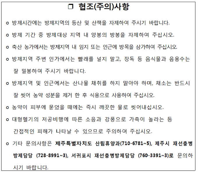 또한, 항공방제 기간 중 양봉 및 축산농가 등에 협조사항을 전달하고 항공방제로 인한 피해가 발생하지 않도록 다음사항에 대한 주의를 당부하고 있다.