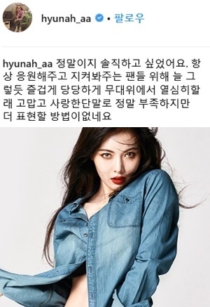 3일 현아는 자신의 SNS을 통해 “정말이지 솔직하고 싶었다”며 “항상 응원해주고 지켜봐주는 팬들 위해 늘 그렇듯 즐겁게 당당하게 무대위에서 열심히할래 고맙고 사랑한단말로 정말 부족하지만 더 표현할 방법이 없네요”라고 털어놨다.