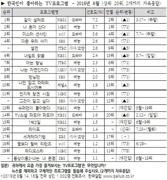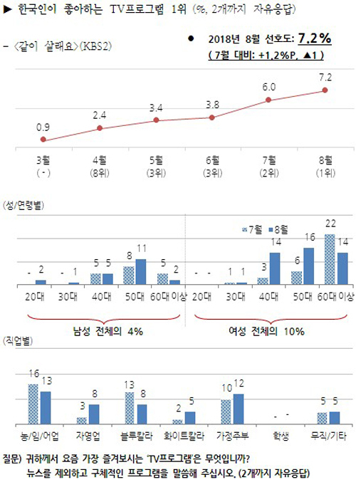 한국갤럽이 2018년 8월 14일과 16일 양일간 전국 만 19세 이상 남녀 1,002명에게 요즘 가장 즐겨보는 TV프로그램을 물은 결과(2개까지 자유응답), KBS2 주말 드라마 <같이 살래요>가 선호도 7.2%로 1위를 차지했다.