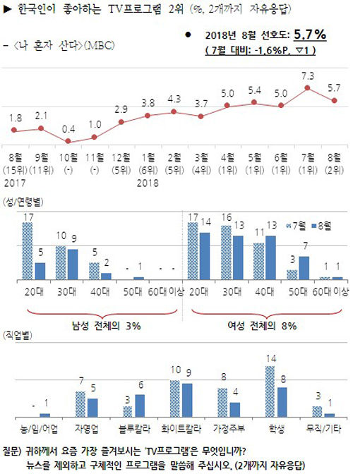 ● 2018년 8월 한국인이 좋아하는 TV프로그램 2위: <나 혼자 산다>(MBC) 5.7%