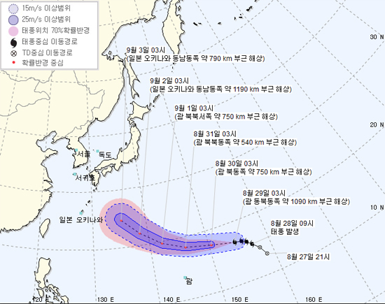 태풍은 9월 1일 오전 3시경 중심기압 960 헥토파스칼의 강 소형급으로 몸집을 더 키운채 괌 북북서쪽 약 750km 부근 해상까지 접근해 진로를 우측으로 틀어 서귀포 방향으로 서북서진 할 것으로 전망된다.