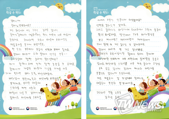 『할머니의 여름휴가』는 할머니께 즐거운 여름휴가를 선물하고 싶은 아이의 마음이 담긴 그림책이다. 김라윤 학생이 쓴 한글 손 편지에는 코로나 때문에 휴가를 가지 못한 아쉬움과 그림책 속 할머니가 시원하고 건강하게 휴가를 잘 보내기를 바라는 따뜻한 마음이 담겨 있다. 봉담도서관에서는 김라윤 학생에게 상장 전달식을 진행할 예정이다.