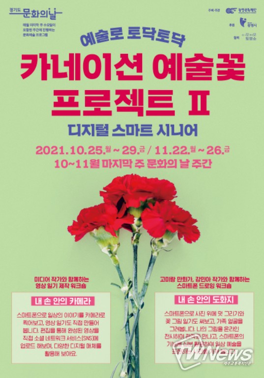 ‘카네이션 예술꽃 프로젝트 Ⅱ’는 매월 마지막 주 문화의 날 주간에 운영되며 10월은 광명문화의집, 11월은 광명시민회관에서 진행된다. 아울러 어르신들이 프로그램을 안전히 즐길 수 있도록 방역 수칙을 철저하게 준수할 계획이다.