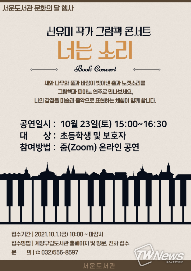 [제주교통복지신문 김지홍 기자] 인천광역시 계양구 서운도서관은 10월 문화의 달을 맞아 오는 23일 신유미 작가를 초청해 「너는 소리」 온라인 그림책 공연을 줌(ZOOM)으로 진행한다.