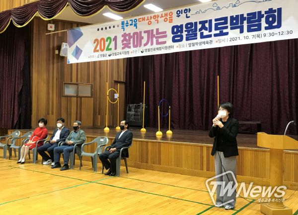 [제주교통복지신문 김지홍 기자] 영월진로체험지원센터는 10월 7일 목요일 영월학생체육관에서 특수교육대상학생을 대상으로 2021 영월진로박람회를 개최했다. 코로나19시기인 2021학년도에는 학생들이 자기주도적 진로 설계와 다양한 직업의 세계를 탐색해보는 진로박람회를 영월관내 초·중·고(봉래초, 마차초, 봉래중, 쌍룡초, 옥동초, 석정여중, 석정여고)의 7개의 학교로 찾아가서 진행하여 학생들의 큰 호응을 얻었다.