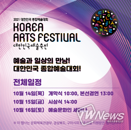 [제주교통복지신문 김지홍 기자] 구미시는 구미문화예술회관에서 10월 14일부터 10월 15일까지 (사)한국예술문화단체총연합회 주관으로 2021 대한민국예술축전을 개최한다.