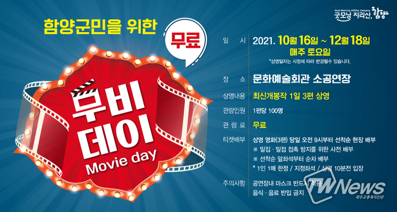 [제주교통복지신문 김지홍 기자] 함양군문화예술회관은 영화 관람을 위해 인근 도시로 가야 하는 군민들의 불편을 해소하기 위해 오는 10월 16일부터 12월 8일까지 매주 토요일 최신 개봉영화 3편을 무료로 상영한다.