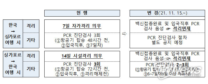 한편, 외교부는 「한-싱가포르 예방접종증명서 상호인정」에 별도 합의(11. 15. 동시 시행 예정)했다. 이는 한국-싱가포르 간 여행안전권역에 따른 격리완화 시행의 제도적 기반이 될 것이다.