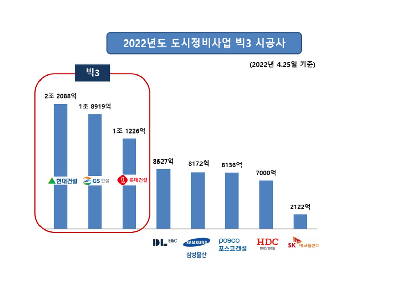 관련 업계에 따르면 4월 25일 기준 올해 도시정비사업 수주 실적에서 뚜렷한 3강 체제가 구축됐다. 현대건설이 2조2088억원, GS건설이 1조8919억원으로 1, 2위를 차지하고 있고, 롯데건설이 1조1226억원의 실적으로 그 뒤를 이으며 ‘수주 빅3’를 형성하고 있다.