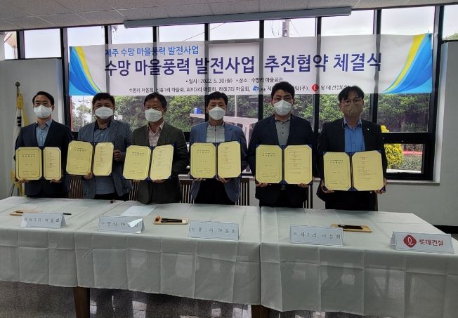 [제주교통복지신문 김현석 기자] 서귀포시 남원읍에서는 지난 5월 30일 김재근(신흥1리), 문정일(위미3리), 허승필 (하례2리 이장)과 제이원 윈드파워, 롯데건설이 참여한 가운데 '수망마을 풍력 발전 사업'을 위한 추진 협약식을 가졌다.