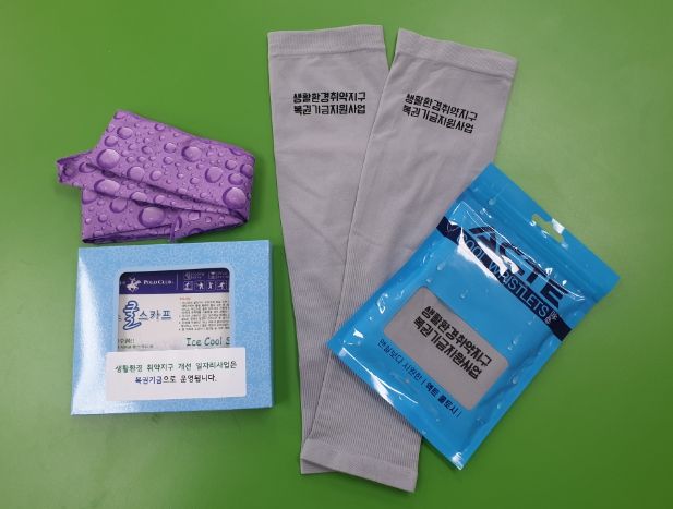 배부 물품은 근로자 대상 공통적으로 팔토시, 쿨스카프를 제공하고 클린하우스 야외 근로자에게는 추가로 여름철 장마 대비 다회용 우비를 배부할 예정이다.