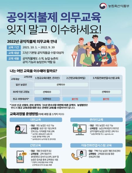 ③ 정규교육 대상자는 22년 신규 신청자, 관외 경작자, 21년 준수사항 위반자, 농업법인으로 온라인 정규교육으로 정규과정을 수강하거나 지자체에서 시행하는 대면 교육 수강이다.