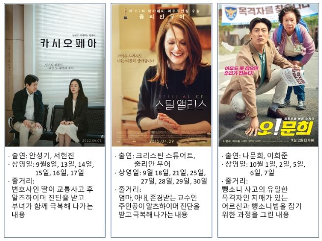 상영하게 될 영화는 치매 극복을 주제로 다룬 영화 카시오페이아, 스틸 앨리스, 오! 문희 총 3편을 선정하여 9월 8일에서 10월 7일까지 한림작은영화관에서 상영한다.