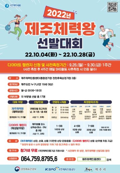 [제주교통복지신문 김현석 기자] 제주시는 운동의 필요성을 체감하고 체육활동 참여기회를 확대하기 위해 2022년 시민건강프로젝트 '제주체력왕 선발대회'를 개최한다고 밝혔다.