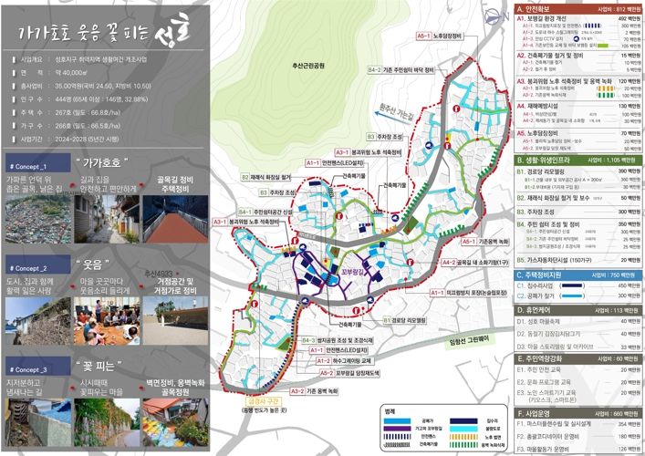 성호지구 새뜰마을사업이 이번 공모에 선정됨에 따라 총사업비 35억원 중 국도비 약 27억원을 지원받게 되며, 안전확보 사업, 생활·위생인프라 지원, 주택정비지원 사업 등 5가지 분야로 2024년부터 2028년까지 총 5년간 시행된다.