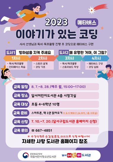 [제주교통복지신문 김강석 기자] 대구 달서구는 7월 10일에서 20일까지 달서어린이도서관에서 2023년‘ 이야기가 있는 코딩’과 ‘공공도서관 메이커프로그램’참여자를 모집한다.