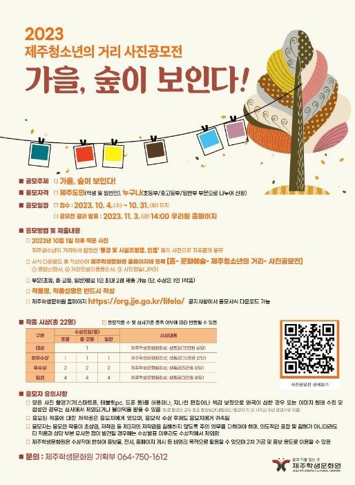[제주교통복지신문 박희찬 기자] 제주도교육청 제주학생문화원은 2023년 두 번째 제주청소년의 거리 사진공모전‘가을, 숲이 보인다!’를 운영한다.