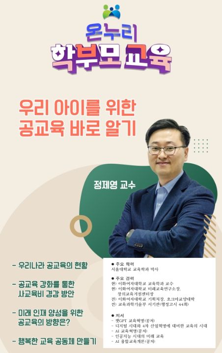 [제주교통복지신문 박희찬 기자] 제주특별자치도교육청은 10월 13일 제주관광대학교 컨벤션홀에서 이화여자대학교 교육학과 정제영 교수를 초청하여 제주도내 학부모를 대상으로‘우리 아이를 위한 공교육 바로 알기’특강을 진행한다고 밝혔다.