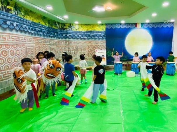 다른 한편에서는 여러 명의 친구들이 힘을 모아 사자로 변신하는 북청사자놀이도 하고, 친구들이 연주하는 전통악기 소리에 맞추어 탈과 한삼을 쓰고 우리나라 전통춤을 추기도 했다. 또한 옛날 사람들이 쓰던 호롱불 만들기도 하며 옛 조상의 생활모습에 대해 이해하는 시간을 가졌다.