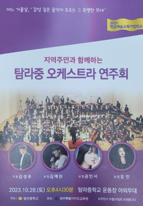 [제주교통복지신문 박희찬 기자] 제주도교육청 예술드림거점학교인 탐라중학교는 10월 28일 오후 4시 30분 탐라중학교 운동장 야외무대에서‘지역주민과 함께하는 탐라중 오케스트라 연주회’를 개최한다.