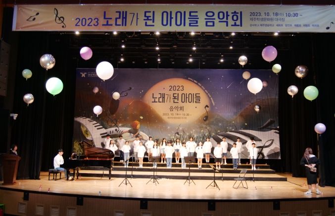 새로운 학생문화예술의 씨앗을 심는 마음으로 마련된 『2023 노래가 된 아이들 음악회』는 재릉초, 저청초, 장전초, 세화초, 하귀초, 제주영송학교 6교 학생들이 김정희 아동문학가의 시창작 수업과 학생들이 직접 창작한 시에 제주초등음악연구회 교사들이 작곡을 붙여 노래로 발표하는 무대로 진행됐다.