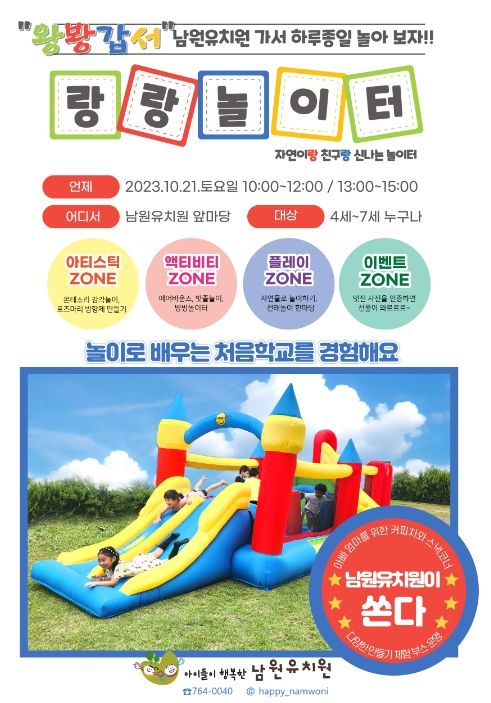 아티스틱ㆍ액티비티ㆍ플레이ㆍ이벤트 ZONE으로 총 4개 ZONE의 놀이의 장이 마련되며 남원유치원이 직접 준비한 간식차‘남원유치원이 쏜다’도 준비될 예정이다.