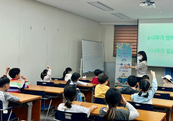 수업 첫날은 강사가“내가 사랑하는 나무의 계절”그림책을 읽어주고 나무가 하는 일과 계절마다 다른 나무의 모습을 이야기한 후 나무 심기 놀이를 진행했다.