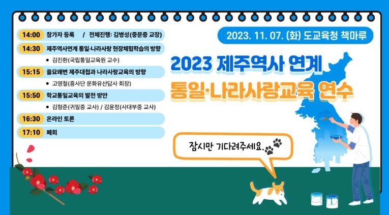 [제주교통복지신문 박희찬 기자] 제주특별자치도교육청과 제주통일교육센터는 초‧중‧고등학교 통일교육 담당 교원을 대상으로 제주역사와 연계하여 학교 통일교육의 발전 방안을 찾는 '제주역사 연계 통일‧나라사랑 연수'를 11월 7일 오후 2시 30분부터 도교육청 1층 책마루에서 온라인으로 공동 개최한다. 연수 내용은 제주도교육청 유튜브로 생중계한다.
