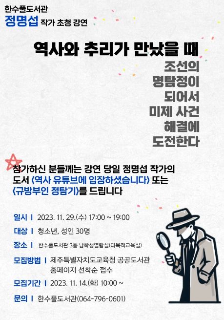 이번 강연은 역사와 추리 등 다양한 장르를 넘나들며 작품활동을 하고 있는 정명섭 작가와 함께 직접 탐정이 되어서 조선시대 실제 발생한 사건 해결에 도전해보고 아울러 역사와 추리가 어떻게 결합됐는지에 대해서도 얘기나눠볼 예정이다.