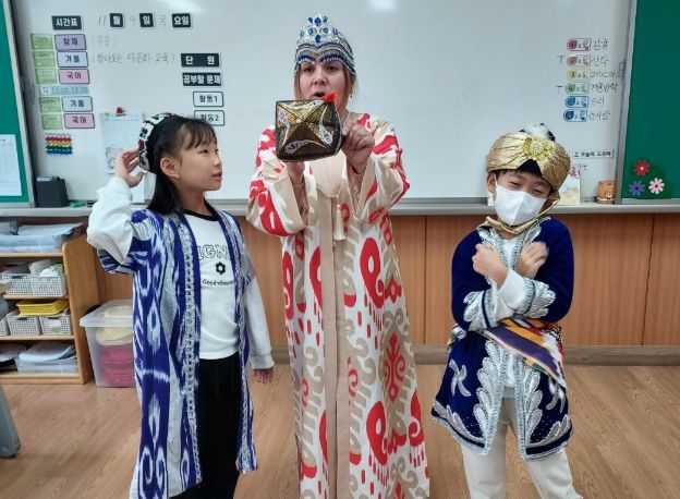 이날 다문화 교육을 맡은 우즈베키스탄에서 온 굴노자 강사는 ‘우리가 만드는 차별 없는 세상’ 주제로 우즈베키스탄의 위치, 수도, 자연환경, 인사법, 학교생활에 대해 자세히 설명했다.