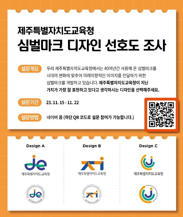 선호도 조사는 도민 누구나 참여할 수 있고, 참여방법은 URL 또는 QR코드, 교육청 홈페이지는 통해 접속이 가능하며, 가장 마음에 드는 디자인을 선택하면 된다. 신제주로터리, 제주시청 주변, 서귀포 1호 광장 등에서는 현장투표도 운영된다.