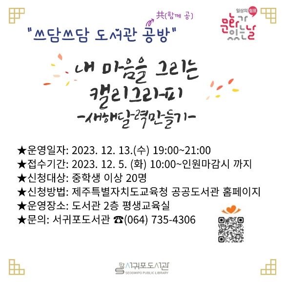[제주교통복지신문 박희찬 기자] 제주도교육청 서귀포도서관은 지역 주민들과 함께 소통하고 세대간, 이웃간 함께 어우러질 수 있는 시간을 갖고자 2023년 12월 문화가 있는 날‘쓰담쓰담 도서관 공방’원데이 클래스를 마련하여 “내 마음을 그리는 캘리그라피” 참가자를 모집한다.