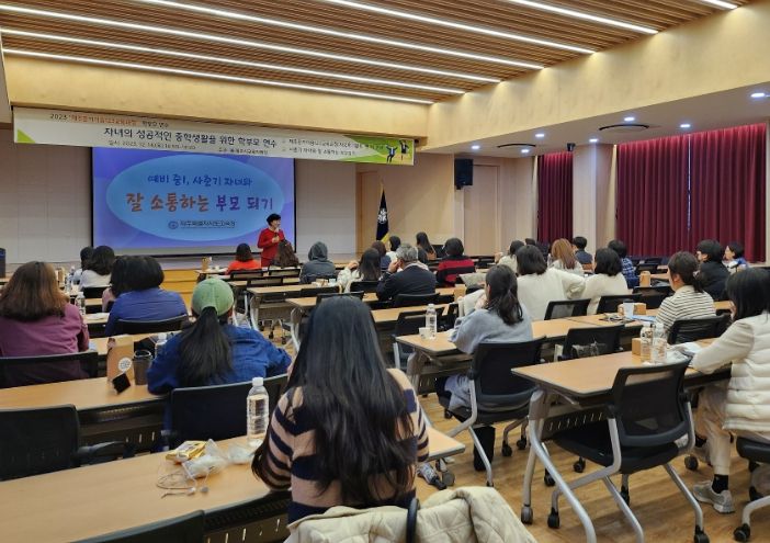 [제주교통복지신문 박희찬 기자] 제주시교육지원청은 14일 제주시교육지원청 대회의실에서 관내 초등학교 예비 중학생 학부모 대상으로‘자녀의 성공적인 중학생활을 위한 학부모 연수(제주꿈끼이음123교육과정 연수)’를 실시했다.