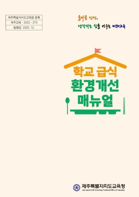[제주교통복지신문 박희찬 기자] 제주특별자치도교육청은 급식종사자의 산업재해를 예방하고 안전한 근로환경 및 쾌적한 급식환경 조성으로 급식종사자 건강권 확보와 수요자 급식 만족도 제고를 위해‘학교급식 환경개선 매뉴얼’을 제작·보급했다.