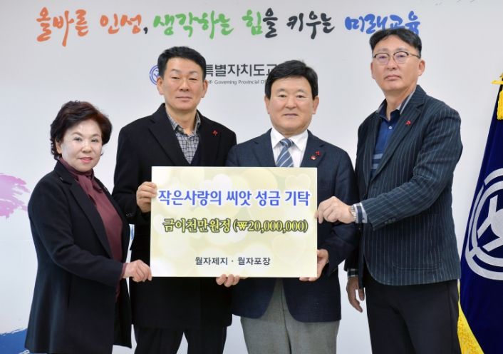 [제주교통복지신문 박희찬 기자] ㈜월자제지·(주)월자포장에서 18일‘작은 사랑의 씨앗’성금으로 제주특별자치도교육청에 2천만원을 기탁했다.