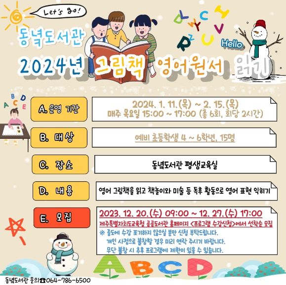 프로그램 운영 기간은 2024년 1월 11일 ~ 2월 15일 매주 목요일 15:00 ~ 17:00(총 6회, 회당 2시간)이며 예비 초등학생 4 ~ 6학년 15명을 대상으로 동녘도서관 평생교육실에서 영어 그림책을 읽고 책 놀이와 미술 등 독후 활동으로 영어 표현을 배워본다.