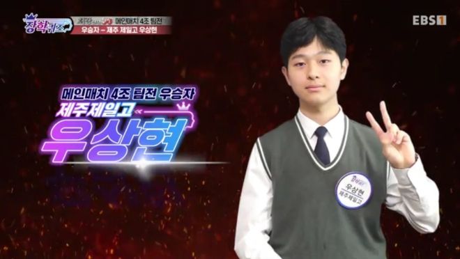 [제주교통복지신문 박희찬 기자] 제주도교육청 제주제일고등학교에 재학 중인 우상현 학생(1학년)이 EBS '장학퀴즈'에 출연하여 메인매치 4조 팀전에서 우승을 차지했다.