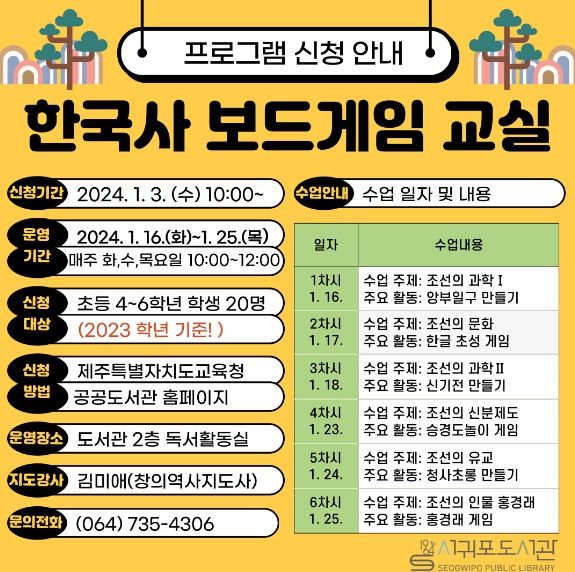 [제주교통복지신문 박희찬 기자] 제주도교육청 서귀포도서관은 어린이들에게 우리 역사를 이해하고 올바른 역사의식을 키우는 학습 기회를 제공하고자‘2024년 한국사 보드게임 교실’참가자를 모집한다.