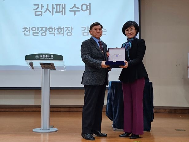 김공순 선생은“앞으로도 바른 인성으로 학업에 정진하며 특기를 신장하기 위해 노력하는 효돈중학교 후배들을 꾸준히 지원하겠다”는 포부를 밝혔다.