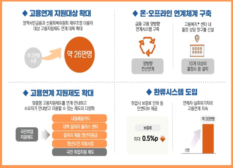 정책서민금융·채무조정을 이용하는 서민·취약계층에 대한 금융·고용 간 연계가 일회성이 아니라 지속적이고 체계적으로 이루어질 수 있도록, 금융지원제도와 고용지원제도 간 상호 연계를 강화하는 환류시스템을 마련한다.