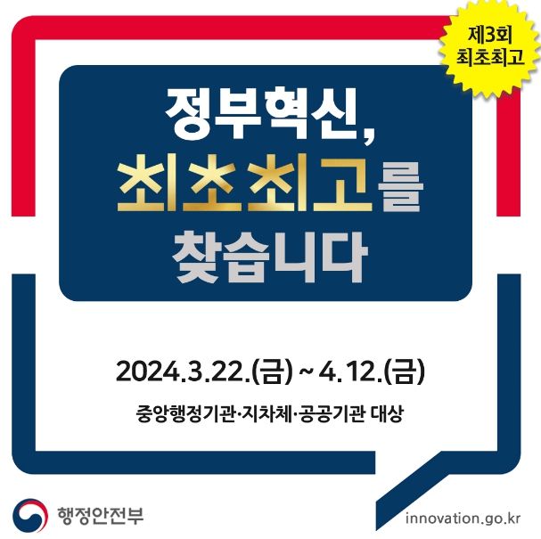 [제주교통복지신문 박상현 기자] 행정안전부는 한국행정연구원과 함께 오는 4월 12일까지 중앙·지방 행정기관 및 공공기관을 대상으로 공모를 통해 제3회 ‘정부혁신 최초‧최고’ 선정을 추진한다.