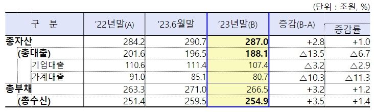 총대출은 188.1조원으로 ’22년말 대비 △13.5조원(△6.7%) 감소했는데, 기업대출(107.4조원)은 ‘22년말 대비 △3.2조원(△2.9%), 가계대출(80.7조원)은 △10.3조원(△11.3%) 감소했다.