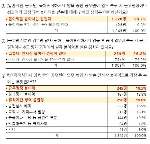육아휴직자 소속부서는 인력 누수에 따른 대체인력 확보가 쉽지 않고, 육아휴직 복귀자・양육의무자들은 조직 필요성 등을 이유로 기피부서나 원거리 위치부서로 발령받는 등 복직 전 안내도 미흡해 업무 적응과 육아를 병행하기 어렵다는 등 불만 의견이 많았기 때문이다.