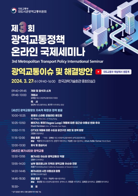 국토교통부 대도시권광역교통위원회는 3월 27일 오전 9시 40분 한국과학기술회관(서울)에서 ‘광역교통이슈 및 해결방안’(Metropolitan Transportation Issues and Solutions)을 주제로 「제3회 광역교통정책 국제세미나」를 개최한다.